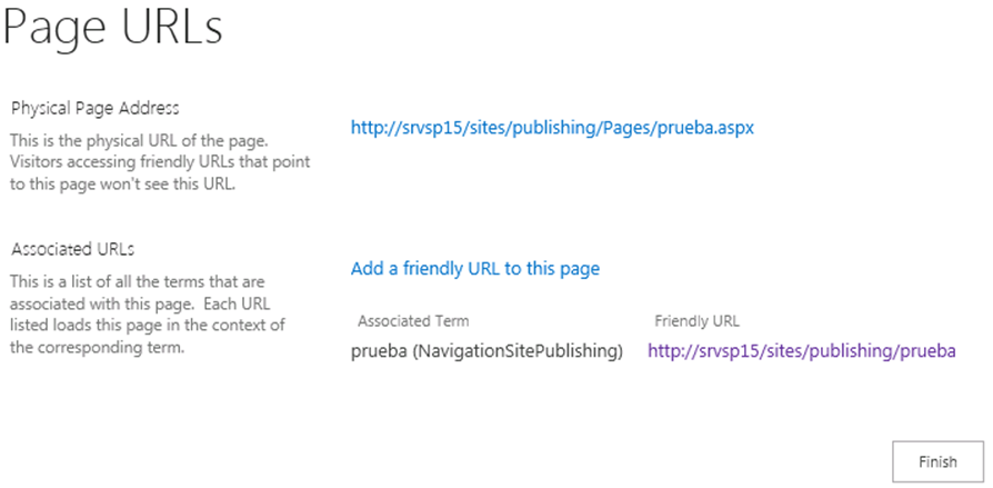 Además podemos asignar varios términos o urls a una misma página física por si queremos realizar algún tipo de filtrado dependiendo de la URL. Para ello clicamos en “Add a friendly URL to this page” e insertar allí el término de metadatos administrados.