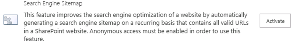 Para poder activar esta característica en los sitios de publicación debemos tener autenticación como anónimo activada y activar una característica a nivel de Colección de sitios. Esta característica se llama “SearchEngineSitemap”: