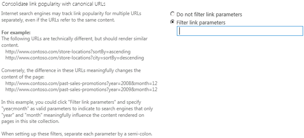 SharePoint 2013 nos permite asignar el meta tag de URL canónica para aquellos sitios que tienes páginas muy similares, cuya única diferencia es un filtrado por query string.