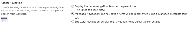 En la “Global Navigation” tenemos dos opciones ahora: Structural Navigation y Managed Navigation (nueva en SharePoint 2013):