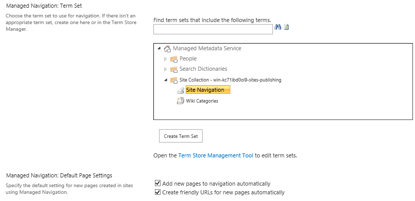 - Si seleccionamos “Managed Navigation” entonces podremos seleccionar un “Term Set” de metadatos administrados que actúe como fuente de términos para la navegación.
