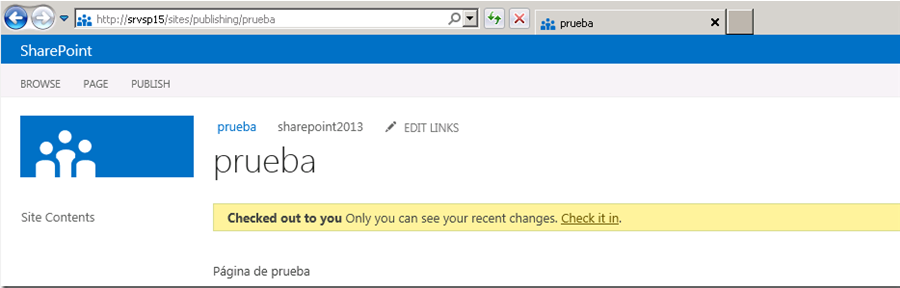 - Una vez activada la navegación nos damos cuenta que la URL de la home cambia y ahora es amigable: “http://srvsp15/sites/publishing/” y además ahora ya tenemos activas las opciones de “Page URLs” y “Edit SEO Properties”.