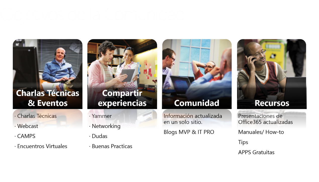 Esta comunidad tendría que aportar una diferencia importante con respecto a la oficial, y que menos que seleccionar a conciencia uno a uno a los mejores profesionales de cada área implicada con Office 365. Profesionales que viven día a día los más y los menos del producto y que con todo mis respetos, se ganan el título de “gurús”. Pero no solo este era el objetivo, en una reunión realizamos un análisis de que debería de aportar una comunidad y el resultado fue el siguiente: