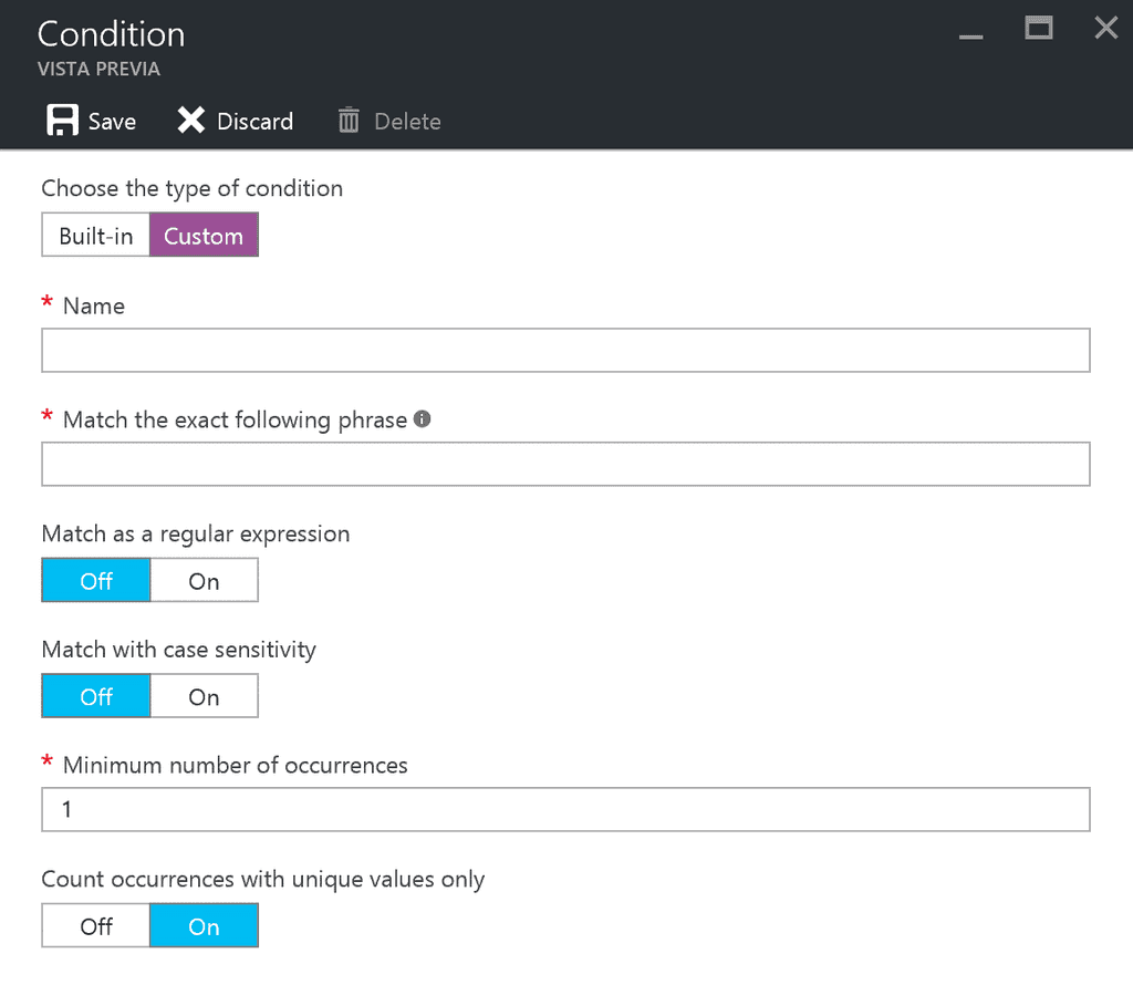 Para las condiciones podemos usar reglas estándares, por ejemplo, tarjeta de crédito, o reglas personalizadas basadas en ocurrencias de texto o expresiones regulares.