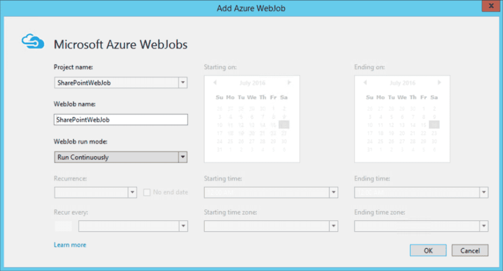 Hay múltiples formas para configurar esta función: continuamente, manualmente, cada determinado tiempo recurrentemente o en una fecha determinada. Por el momento seleccione "Run on demand" en la sección "WebJob run mode" y utilice el botón de "OK".