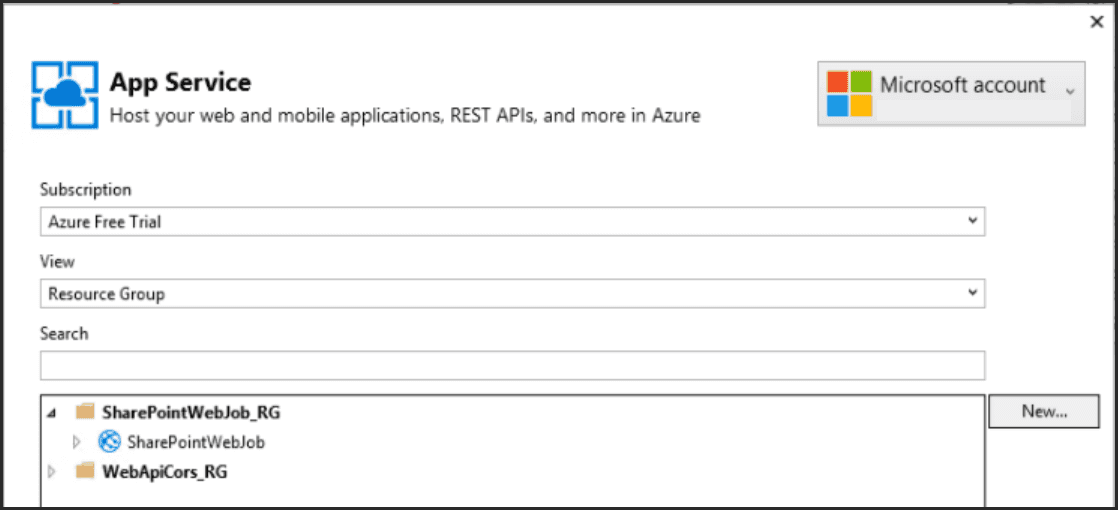 Y en la siguiente ventana seleccione la cuenta a utilizar (probablemente tiene que entrar de nuevo sus credenciales), lo mismo que la suscripción, Grupo de Recursos, etc., y seleccione la Web App que va a contener el WebJob: