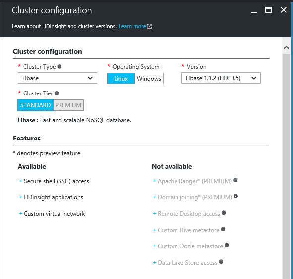 · Configuración del cluster. Este paso posiblemente sea uno de los más importantes ya que estamos dándole forma a nuestro cluster, deberemos decidir el tipo de cluster (Hadoop, Hbase, R Server), si lo queremos en base Linux o Windows y la versión del Hbase. Este paso es importante ya que no podremos modificarlo una vez creado.