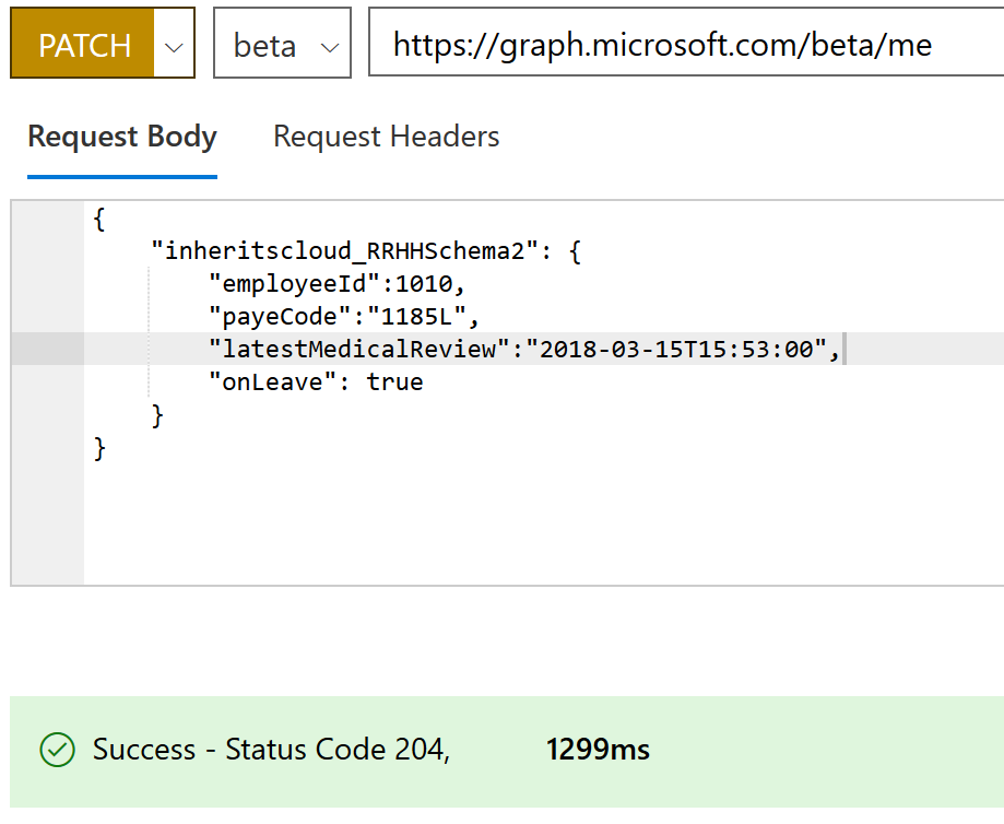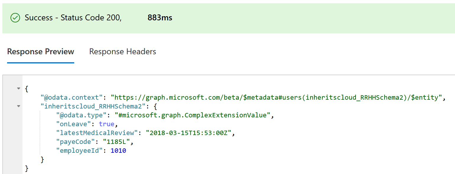 Ten en cuenta que al ser Open extensions, solo tendrán un valor en el caso que hayan sido asignadas, es decir, que, si hacemos esa misma query a un usuario que previamente no hemos asignado la extensión, ésta simplemente devolverá vacía, no esperes encontrar un EmployeId y LatestMedicalCheck con valor null, si no vacío a nivel de Extension.