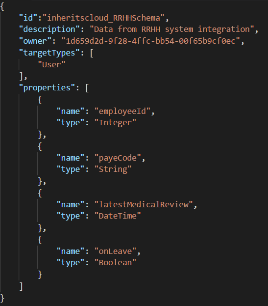 Nota: Fíjate bien en como componer el valor para la propiedad “id”, así como asegurarte de que proporcionas un valor válido para la propiedad “owner” (que debe ser el ID de una Azure AD App registrada en esa tenant). En el siguiente link tienes los diferentes tipos soportados en las properties (básicamente: Binary, Boolean, DateTime, Integer, String):