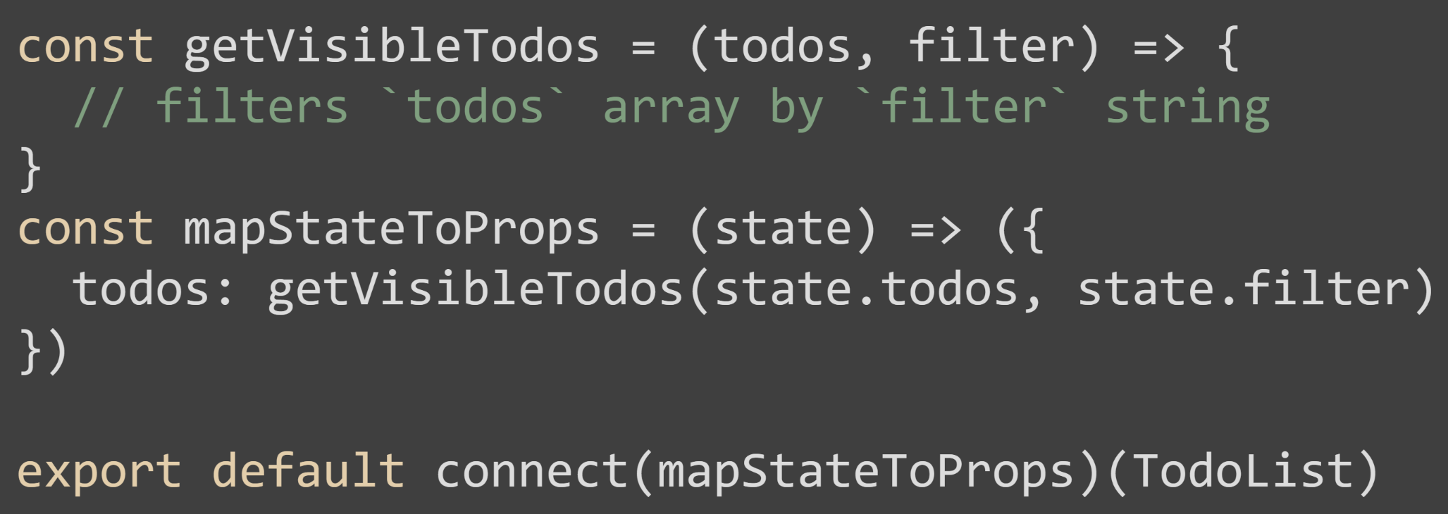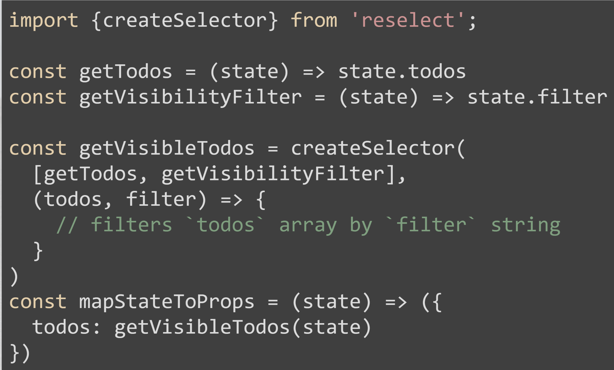 Existe una librería “reselect” que se encarga de unir todas estas propiedades con tal de unificar las llamadas al state global de nuestra aplicación. Quedando la aplicación de la siguiente forma: