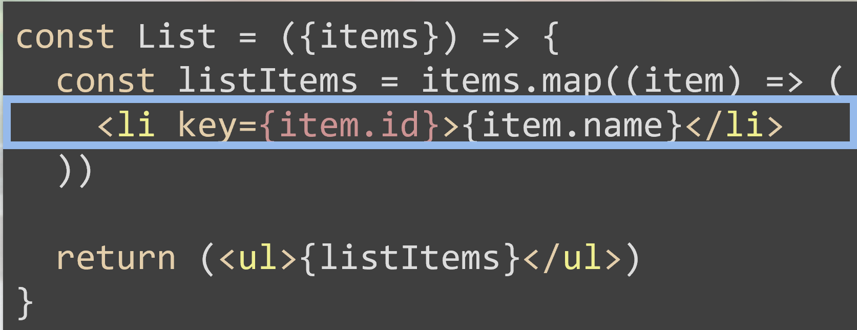 Como vemos si tenemos una variable “index” que la ponemos a todos los <li> que tenemos es lo mismo que no tener nada. Tenemos que poner un código único por ejemplo dentro de la clase ítems podemos tener un Id, que es un elemento único y lo podemos utilizar como “key”