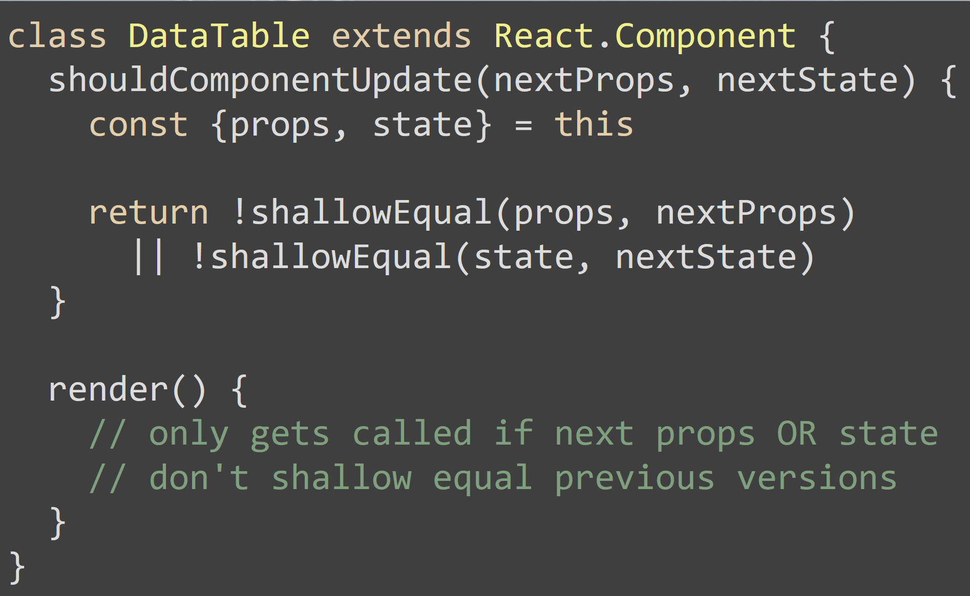 Junto con este tipo de reglas debemos tener en cuenta que hay un método ShouldComponentUpdate. Este método devuelve un valor booleano indicando si tenemos que volver a pintar el componente o no. Sabemos que cada componente de ReactJS se actualiza siempre que se modifica bien el State o las Props, ahora bien, en algunas ocasiones solo queremos volver a pintar el componente si hay algo que cambia su valor bien en el state o bien en las propos, por lo que es recomendable crearse esta función e indicar en qué momento vamos a querer que el componente se reenderize. Por ejemplo:
