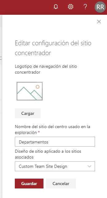 Para asociar nuestro diseño de sitio a un Hub desde la interfaz de usuario, únicamente tendremos que ir a nuestro Hub y acceder a la Configuración del sitio concentrador:
