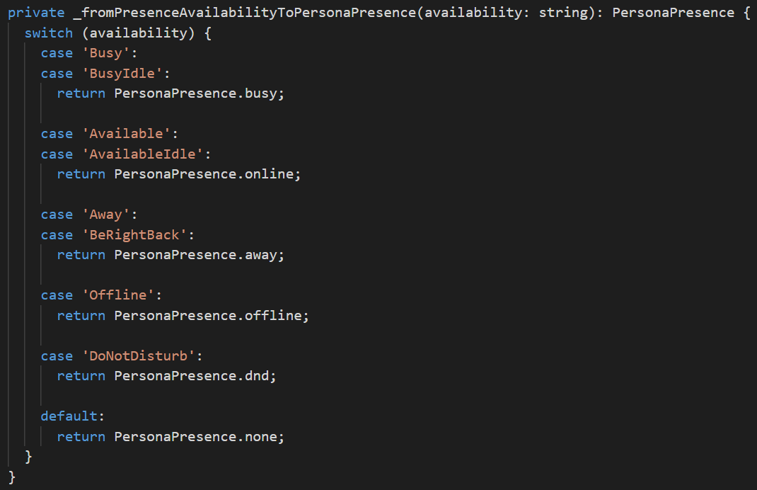 Finalmente, la función _fromPresenceAvailabilityToPersonaPresence, hace un simple mapeo entre la información de availability que viene de la API, y las opciones que ofrece el componente Persona (que a día de hoy no tienen un mapeo uno a uno)