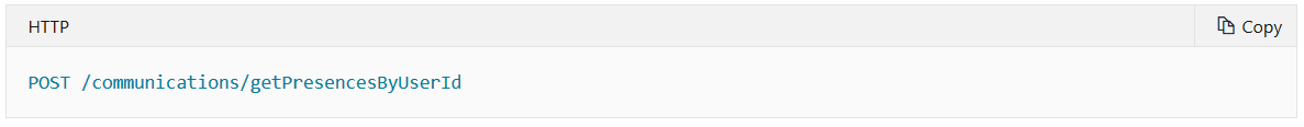 Para obtener la información de presencia de un listado de usuarios, debemos hacer un POST al endpoint /beta/communications/getPresencesByUserId, y enviar en el body la lista con los IDs de los usuarios.