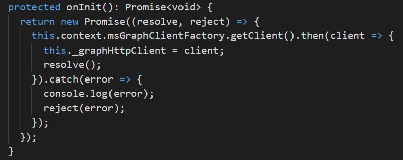 Antes de nada, en el OnInit del WebPart, utilizaremos el objeto msGraphClientFactory para obtener el MSGraphClient