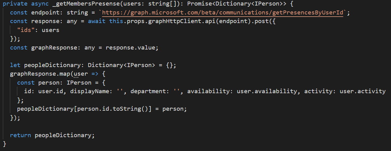 Básicamente llamamos a Graph, y el resultado lo metemos en un diccionario, para posteriormente, actualizar cada usuario del diccionario con su información de presencia.