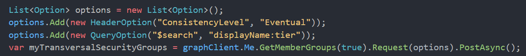 En ocasiones, puede que necesites añadir alguna cabecera a la petición, así que conviene saber cómo hacerlo. Un caso bastante común es que algunas queries a Graph, requieren una cabecera concreta para que la query funcione (ejm: ConsistencyLevel = Eventual), o añadir alguna QueryString que no permite el SDK (Ejm: $Search). Para esos casos, podemos hacer: