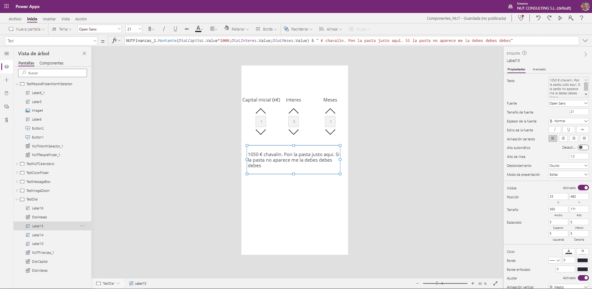 Para probarlo creamos una pantalla con el componente que acabamos de crear, 3 diales para los valores de capital, interés y meses y un label donde invocaremos nuestra "función" de esta forma: