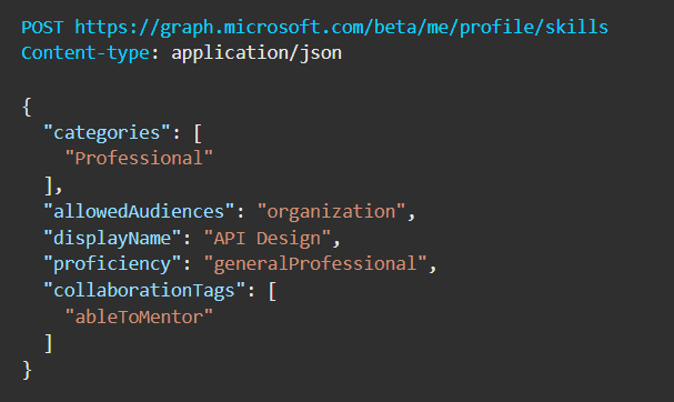 1var skillCreated = await graphServiceClient.Me.Profile.Skills.PostAsync(2 new Microsoft.Graph.Beta.Models.SkillProficiency { DisplayName = "Typescript"});34Console.WriteLine($"New skill {skillCreated.DisplayName} created with Id: {skillCreated.Id}");56