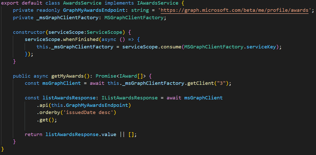 Nota: La clase AwardsService definida arriba, hace uso del objeto ServiceScope proporcionado por el propio framework SPFx. De esta manera podemos sacar el objeto de tipo MSGraphClientFactory ya inyectado también por SPFx.