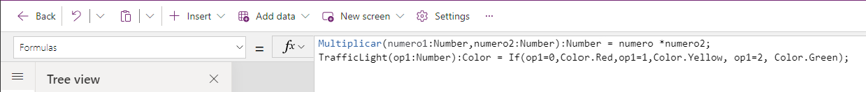 Por último, veamos como invocar a estas funciones, pues es muy fácil solo basta con invocarla como una función cualquiera desde el control indicado. Por ejemplo, veamos como invocar a la función de multiplicación desde un campo de texto, en la opción Text escribimos la formula Multiplicar(2,5) y eso nos multiplicará 2 * 5 y nos pondrá el resultado en el campo de texto o label.