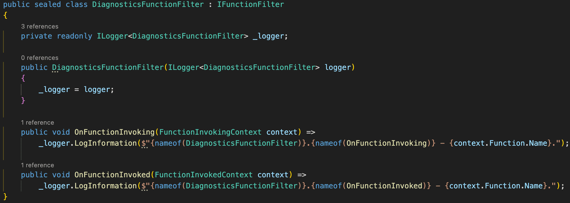 Como te puedes esperar, el método OnFunctionInvoking se ejecuta justo antes de la ejecución de la función, y el OnFunctionInvoked, justo después de la misma. Otra ventaja de los filtros frente a los eventos es que con los filtros puedes crear todos los que necesites, y se ejecutaran en el orden en que los registres. Por ejemplo, aquí tenemos otro filtro que, además, altera el resultado final de la función.