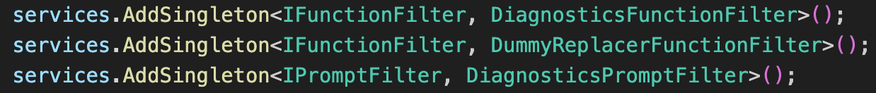 Basta con registrar los filtros en la Service collection, ya que el Kernel builder, llegado el momento, registrara en el Kernel todo aquel objeto que implemente la interfaz IFunctionFilter y este registrado en la Service collection.