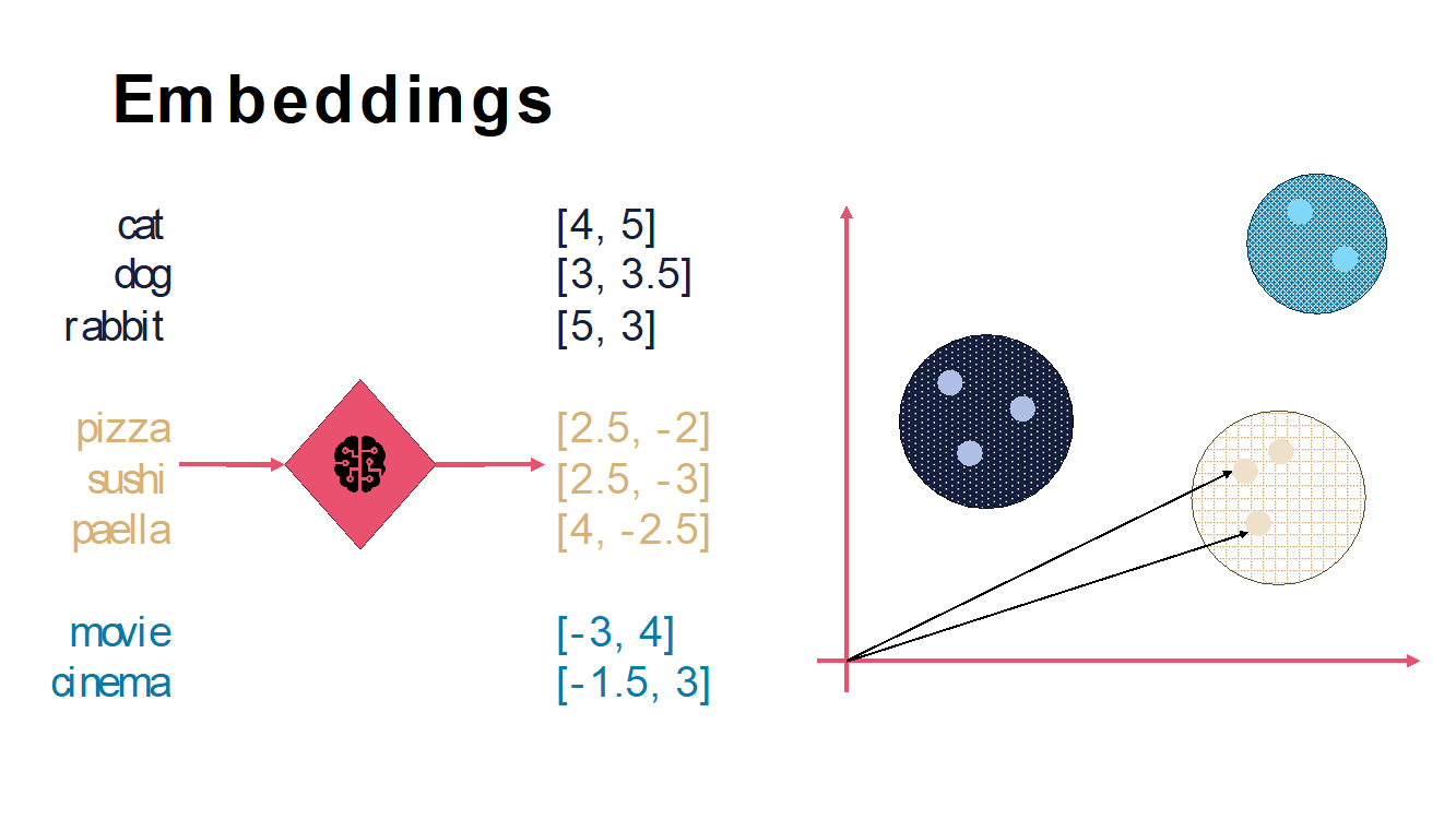 Es aquí donde entran en juego las famosas bases de datos vectoriales. Estas DBs son capaces de almacenar la información en forma de Embeddings. Los Embeddings no es más que una representación numérica de una palabra o texto, generalmente en forma de vectores. Los Embeddings son generados por el propio modelo (generalmente son modelos diferentes a los más conocidos como gpt-4. Actualmente el más usado para el cálculo de Embeddings es el modelo text-embedding-ada-002). Estos Embeddings tienen una característica muy importante para el RAG, y es que son capaces de medir la relación semántica entre dos palabras o textos. Si lo reducimos a palabras, aquellas que están relacionadas semánticamente están más cerca entre sí, que aquellas que no tienen tanta relación. Esta cercanía se mide en un espacio multidimensional y en función de muchísimos parámetros, pero, por ejemplo, las palabras “gato” y “perro” estarán más cercas entre sí, que de la palabra “guitarra”. La siguiente imagen lo ilustra gráficamente con espacio vectorial de 2 dimensiones: