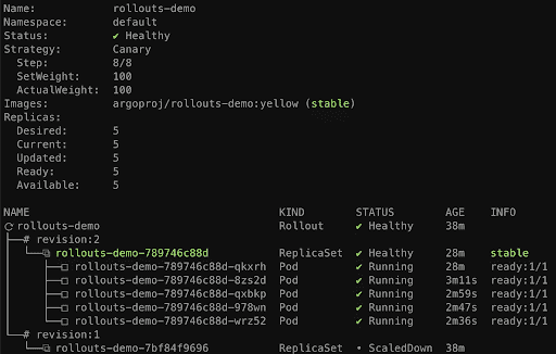 Ahora el Rollout ejecuta los pasos restantes -dirige el trafico al canary al 40%, esperar 10 minutos, incrmenta el trafico al 60%, etc.- hasta dirigir todo el trafico al canary. Ejecute get rollout durante este proceso si desea ver el Rollout en acción. Después de 40 minutos, ejecútalo una última vez para ver el resultado final:
